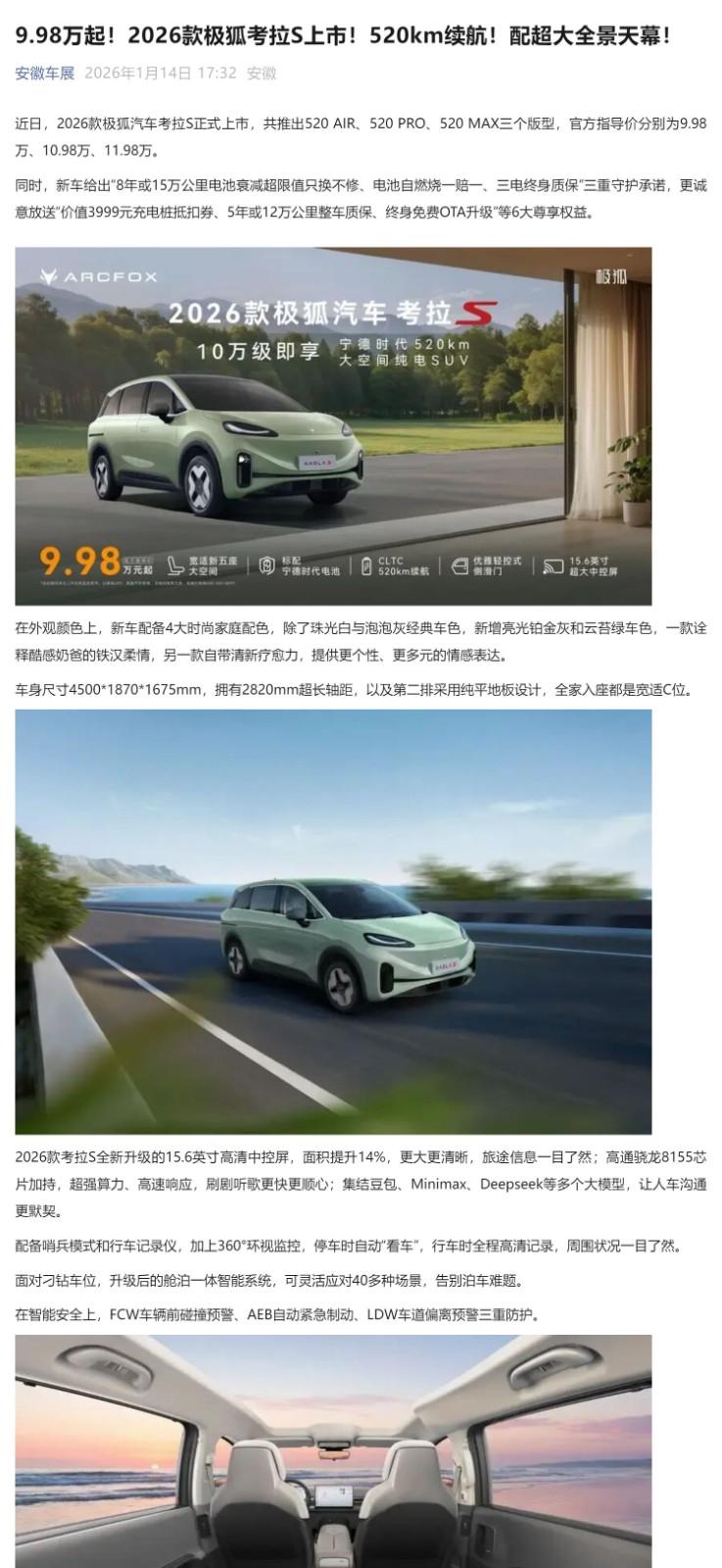 9.98万起!2026款极狐考拉S上市!520km续航!配超大全景天幕!