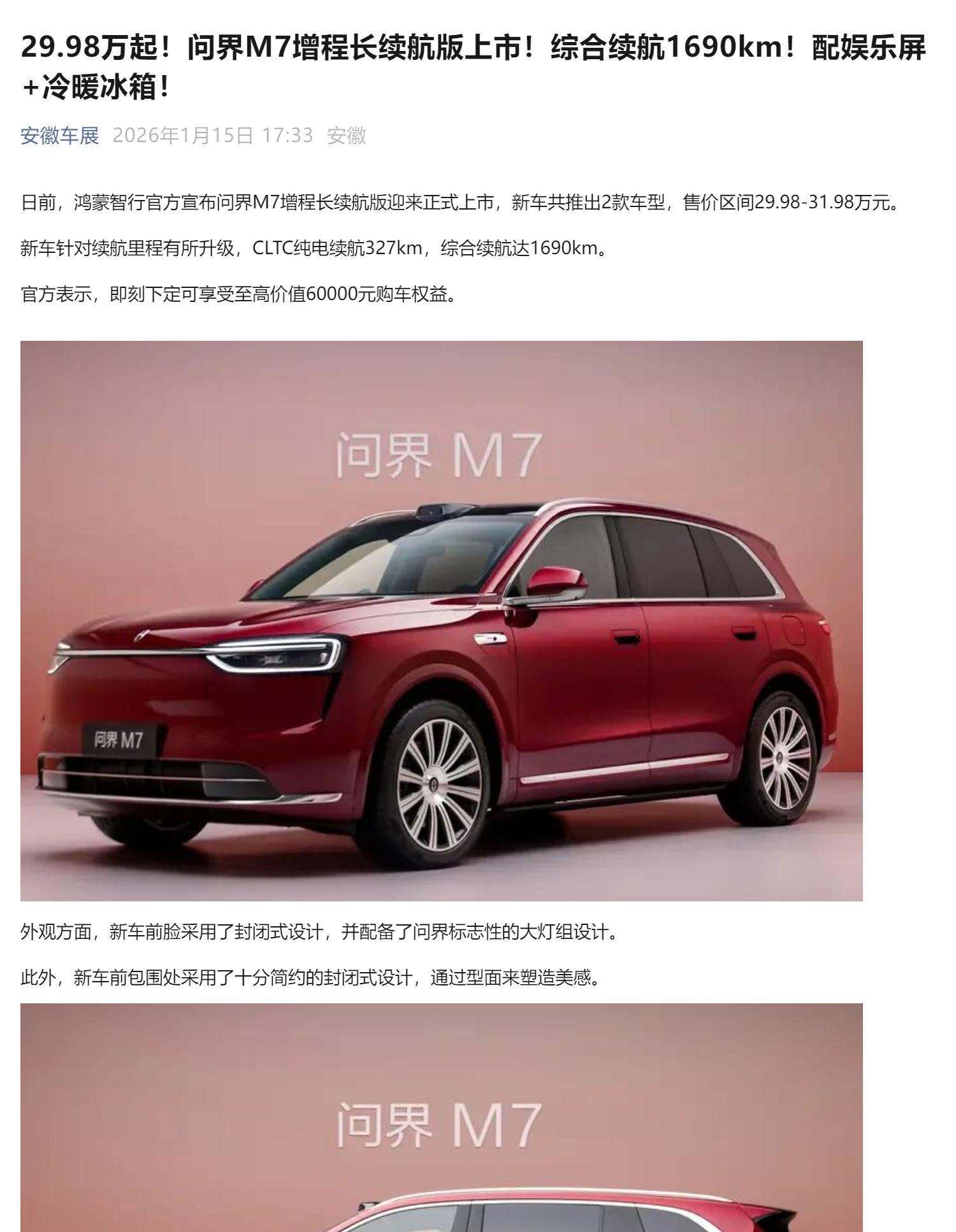 29.98万起!问界M7增程长续航版上市!综合续航1690km!配娱乐屏+冷暖冰箱!