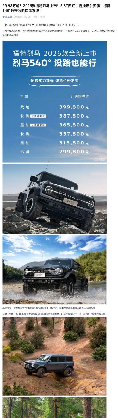 29.98万起!2026款福特烈马上市!2.3T四缸!拖挂牵引资质!标配540°越野透明底盘系统!
